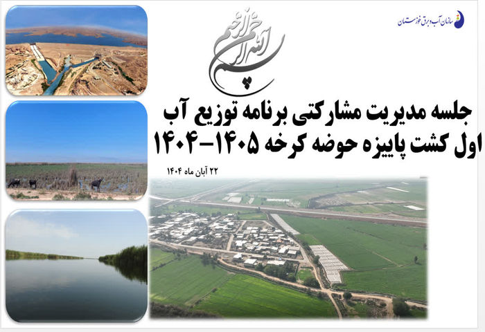 به گزارش شبکه خبری سازمان آب و برق خوزستان، جلسه مدیریت مشارکتی توزیع آب اول کشت پاییزه حوضه کرخه به ریاست علی شهبازی، معاون مطالعات پایه آب سازمان آب و برق خوزستان، و با حضور آرش محجوبی، معاون شبکه‌های آبیاری و زهکشی، نورالدین بازگیر، معاون حفاظت و بهره‌برداری منابع آب، نماینده فرمانداران، مدیران محلی و نمایندگان کشاورزان و مدیران جهاد کشاورزی این حوضه برگزار شد.