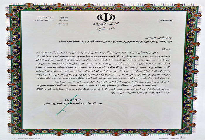 مدیر روابط عمومی سازمان آب و برق خوزستان، با حکم مدیرکل روابط عمومی و اطلاع رسانی وزارت نیرو، به سمت دبیر شورای روابط عمومی و اطلاع رسانی صنعت آب و برق استان منصوب شد.