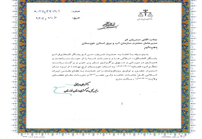 «با عنایت به حدیث شریف «مَن لَم یَشکُرِ المَخلوق لَم یَشکُرِ الخالِق»، تلاش‌ها و زحمات شما را از حیث مساعدت و همیاری در میزبانی و تسهیل برگزاری سفر پرخیر و برکت ریاست معظم قوه قضائیه (مدّ ظلّه‌العالی) به استان خوزستان ارج نهاده؛ از ایزد منان استمرار حضور و توفیق روزافزونتان را در خدمت به نظام مقدس جمهوری اسلامی ایران، تحت عنایات خاصه حضرت ولی‌عصر(عج) و منویات مقام معظم رهبری (مدّ ظلّه‌العالی) مسئلت دارم.