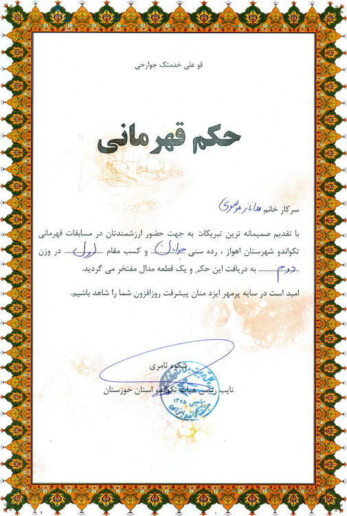 به گزارش شبکه خبری سازمان آب و برق خوزستان، در این دوره از مسابقات که در سطح باشگاه های تکواندو بانوان شهرستان اهواز برگزار شد، "ساناز موسوی" در رده سنی جوانان موفق به کسب مدال طلا و "بهاره موسوی" در رده سنی نوجوانان موفق به کسب مدال نقره شدند.