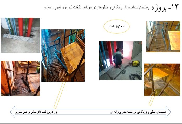 وی، ایمن سازی مسیرهای دسترسی به تجهیزات، ساخت و نصب کاور روی فضاهای باز و پرتگاهی مسیرهای ترد پرسنل، ایمن سازی محوطه های پرتگاهی جرثقیل های مغار نیروگاه، بهینه سازی مسیر دسترسی به بالای ترانسفورماتورهای قدرت، ساخت و نصب پلکان جهت دسترسی به تابلو برق ترانسفورماتورها و فن کوییل ها را از جمله پروژه های انجام شده عنوان کرد.