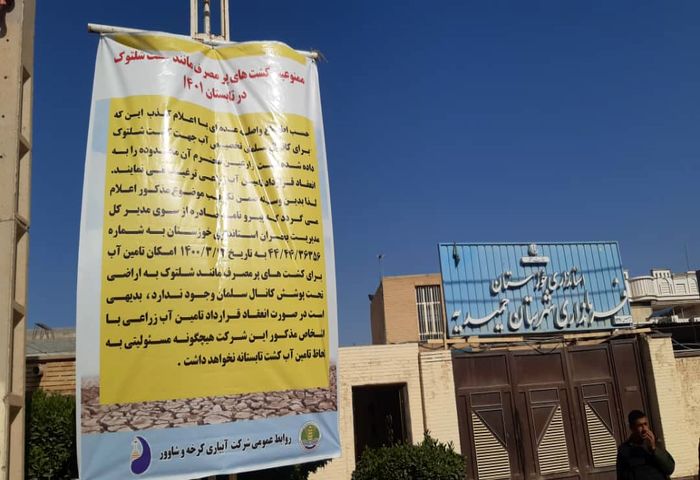 وی با بیان این مطلب که از اواخر سال ۱۴۰۰  با توجه به کمبود شدید منابع آبی و بر اساس تصمیمات استانداری و اعلام سازمان آب و برق خوزستان، ممنوعیت کشت‌های تابستانه در شبکه‌های تحت پوشش این شرکت به طور مکرر اطلاع رسانی‌ شده است افزود: بدین وسیله ضمن تکذیب خبر جعلی تامین آب کانال سلمان در تابستانه ۱۴۰۱ پیرو نامه صادره از سوی مدیر کل مدیریت بحران استانداری خوزستان، مورخ سوم اسفند ماه ۱۴۰۰ اعلام می‌گردد: امکان تامین آب کشت‌های تابستانه  نظیر شلتوک و... در اراضی تحت پوشش کانال سلمان وجود ندارد .